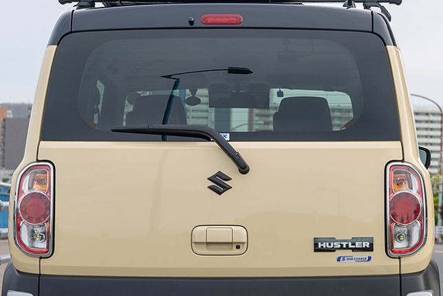 リアハッチのハスラーエンブレムもブラッククロームに白文字でHUSTLERと入ってます。