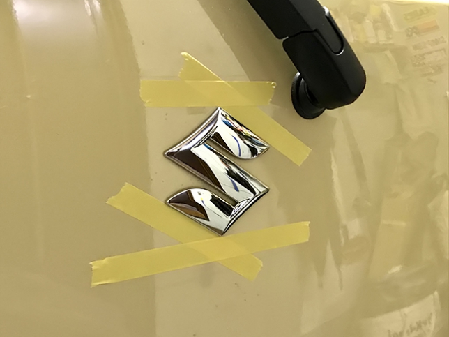 SUZUKIのSマークはセンター出しは楽ですね。こんな感じに直線部分と先端部分をマーキングしておけば簡単です。