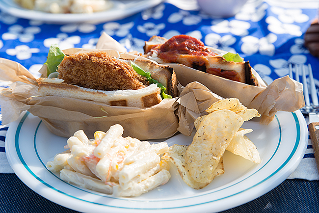 ブランチは焼きたてのベルギーワッフルにソーセージエッグにサラダ
