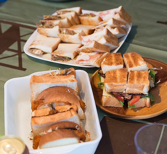自分からはアジフライサンドとローストポークのサンドイッチ、MOMOパパさんからはご自宅の近所のパン屋さんのオリジナル食パンを使ったポテトサラダや生ハム、コンビーフ等を使った贅沢なサンドイッチでランチにしました。