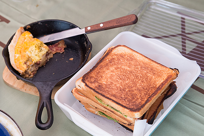 朝食は昨夜の残りのキッシュにパン+レタス+ショルダーベーコン+トマト+千切りキャベツ+マヨネーズ+スライスチーズ+パンの順番で作ったホットサンドに