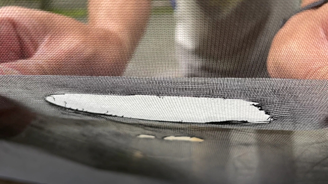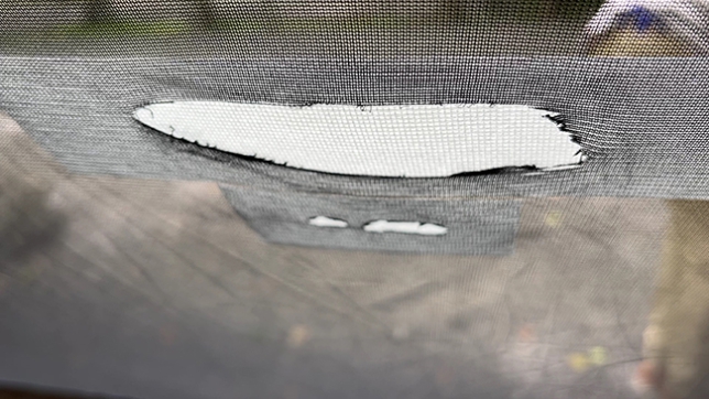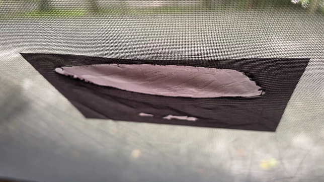 メッシュに粘着テープが貼られたものでこの部分は目を塞いでしまいますが、見た目がテント修復テープよりも良いかな?という程度になりました。でも目立ちますね。