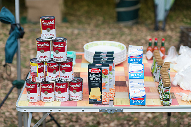 メイン会場では田中ケンさんのダッチオーブンクッキングの食材が並べられてます。ラザニアでしょうかね