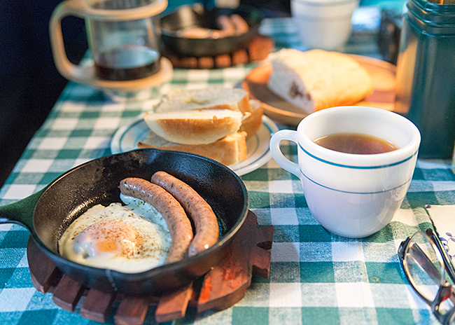 朝食はスキレットでソーセージエッグとパン