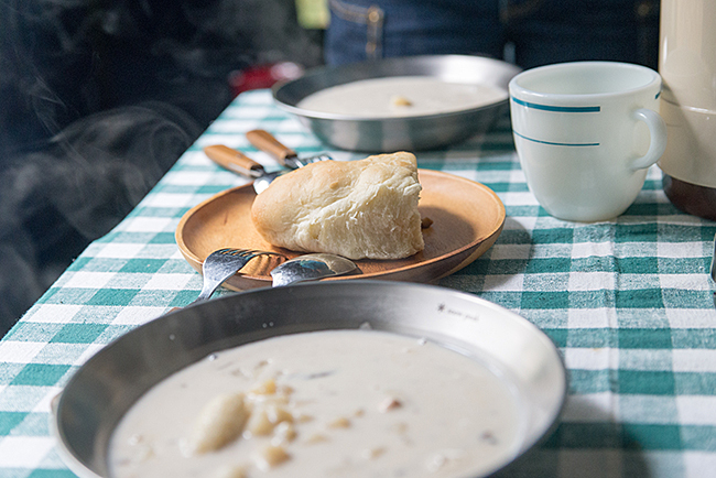 昼食はクラムチャウダーにニョッキを入れたスープにパンと