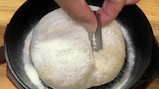 小麦粉をまぶしてクープを入れているところ。斜めに切れ目を入れるらしい
