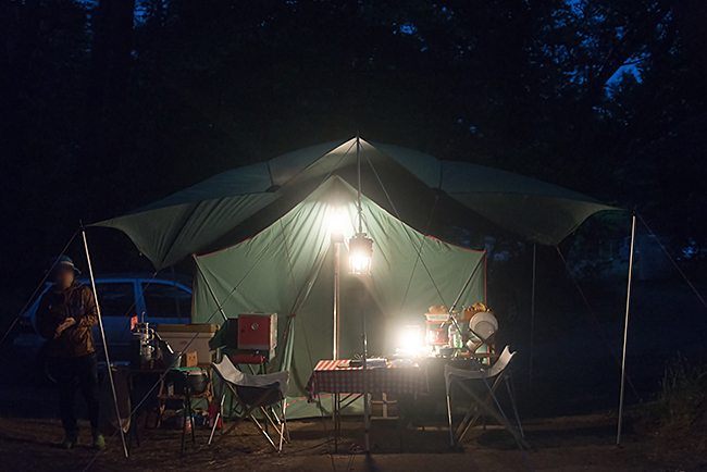 このタープでこのレイアウトにするとちょっと狭いのですが、逆さランタンのKampliteがダイニングランプになって良いんです。