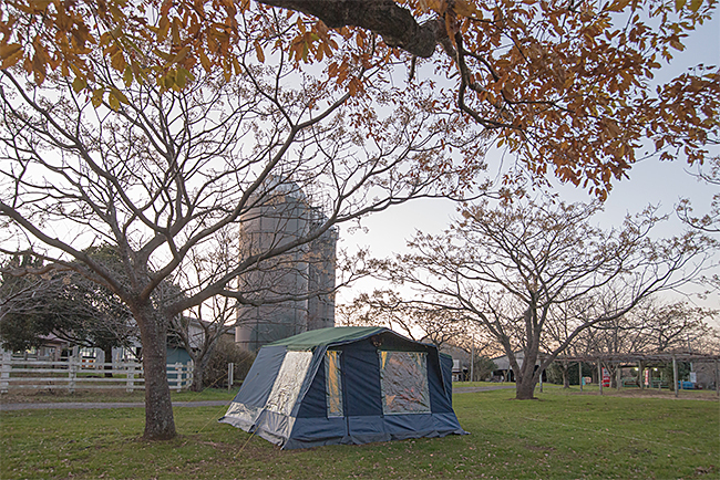サイロ前の電源サイトに設営しました。写真の左右の木はこの時期、クリスマスリースにも使われるナンキンハゼという白い実の成る木です。