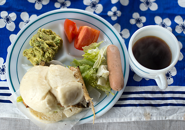 朝食は具無しの中華まんを使った鯖サンドにアボカドディップ、ソーセージなどのワンプレート