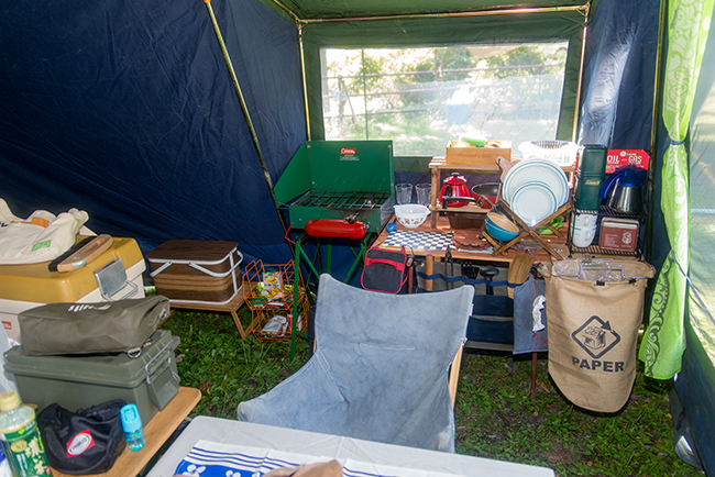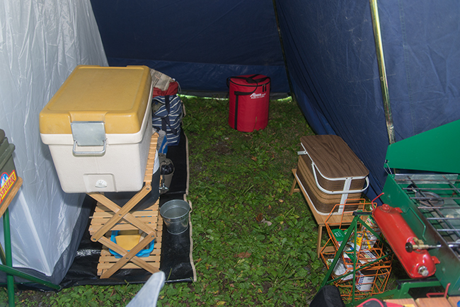 区画は地面にロープで区切られているだけです。このスペースならタープの連結もできたな