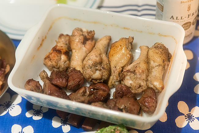 今回の夕飯はお酒のツマミ系かな。手羽元と砂肝のコンフィにジャガイモとタコのガリシア風炒め。