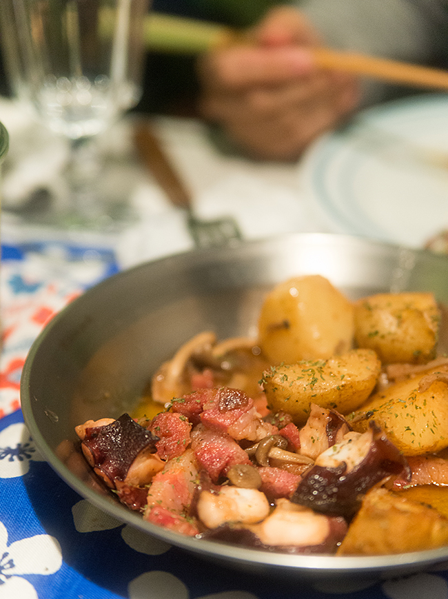 ジャガイモとタコのガリシア風にはパンチェッタ(生ベーコン)とシメジを加えてチリペッパーでアクセントを加えてみました。