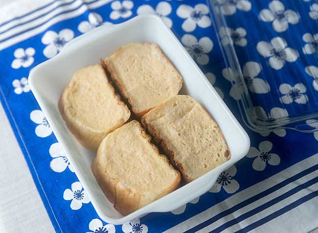 3cmの厚さにカットしたパンを4枚並べて漬込みます。途中で1回裏返します。
