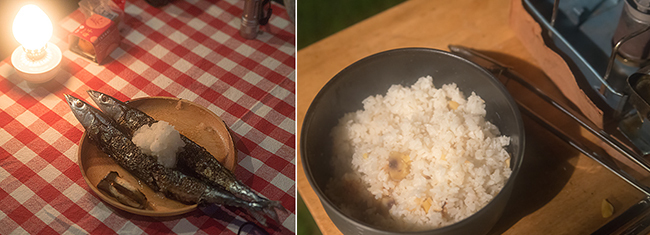夕食は炭火で秋刀魚を焼いて、栗ごはんを炊きました。