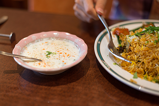 ライタと呼ばれるプレーンヨーグルトに玉ねぎ、キュウリ、トマト、スパイスが入ったスープを掛けて食べるとマイルドになります。