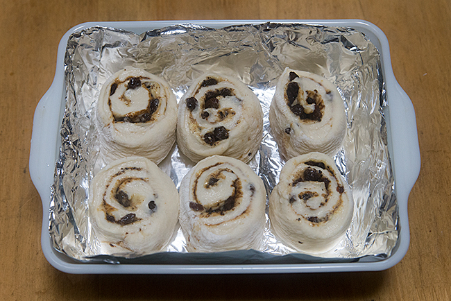 生地を薄く延ばして、溶かしバターを塗ってからシナモンシュガーにインスタント珈琲を振りかけて、レーズンを散らします。
