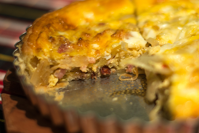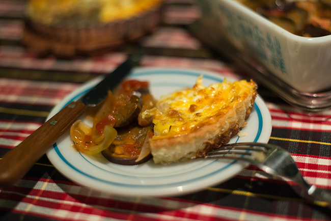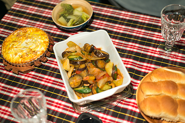 タマネギとベーコンだけが具のキッシュ・ロレーヌとカポナータに野菜スープとロールパン