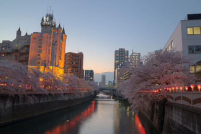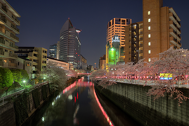 目黒川はズバリその場所です。中目黒方面の川幅が狭くて曲がりくねった所の方が絵的には良いんですけど人が多すぎなんですよねぇ。