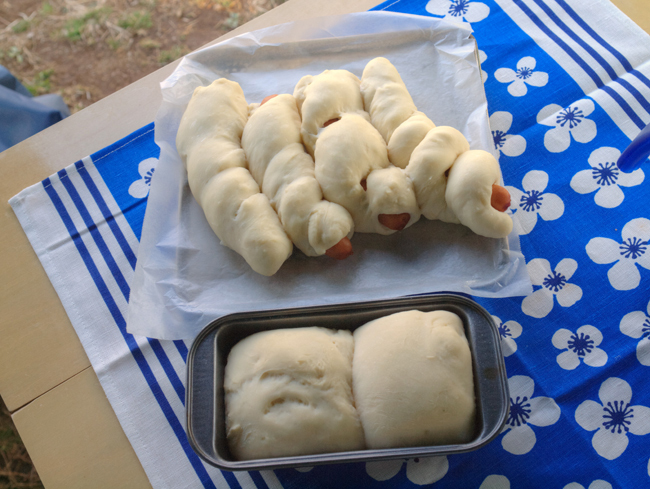 今回のパンは夕食用にシャウエッセンのロングウインナーを使ったロールパンと朝食用の山形角食パン。(写真は2次発酵後)