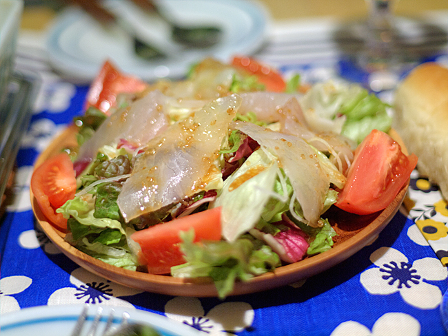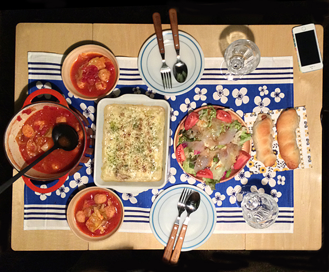 夕飯のメインは、とあるブログを参考に生食可能な牡蠣と長ネギだけのグラタンに鶏団子とキャベツのトマトスープ、鯛のカルパッチョサラダでした。
