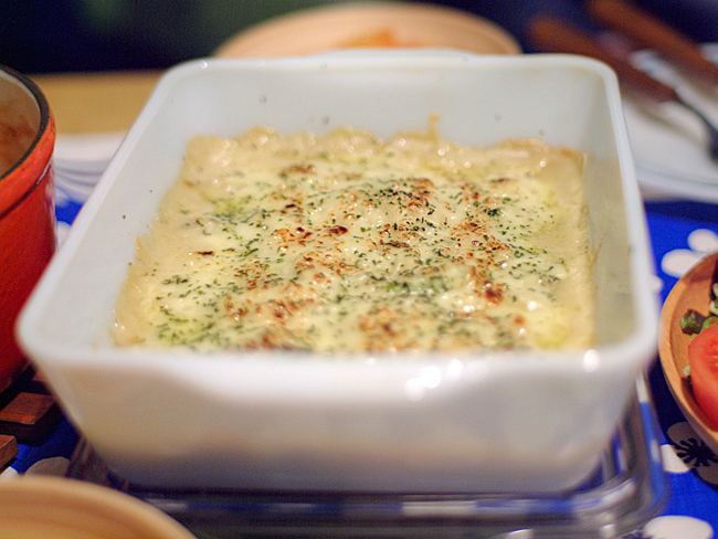 オーブン皿にオリーブオイルを塗ってグラタンソース、チーズ、パセリを載せて200度のオーブンで20分くらい焼いて完成。コレ、美味すぎる♪ また作ろう。