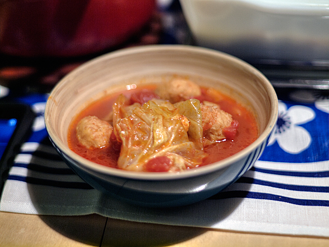 トマトスープはコンソメベースにトマト缶を入れて鶏団子とキャベツを入れてアルパカ任せにしときます。