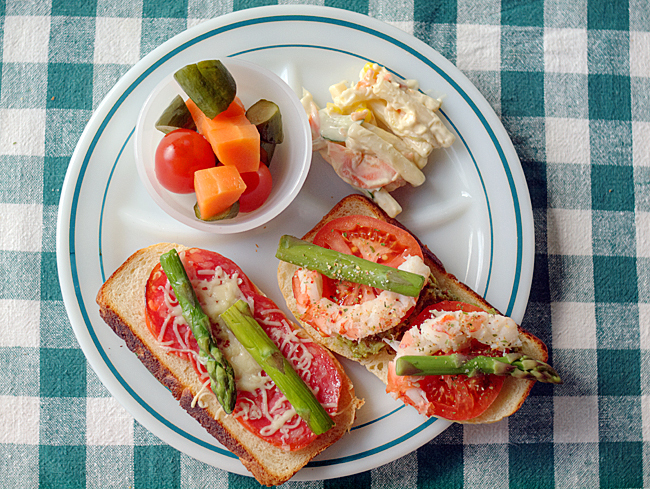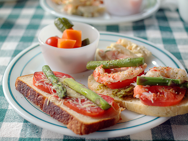 1枚は軽くトーストしてアボカドディップとトマトに海老とアスパラガス、もう1枚はスライストマトにサラミソーセージを載せてチーズとアスパラを載せてオーブンで焼きました。