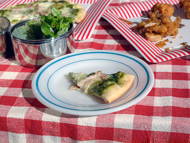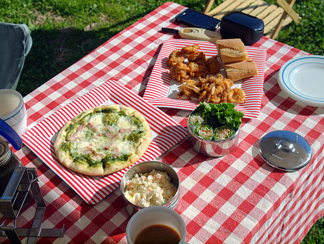 昼食のみなので、簡単にバジルソースとベーコンのジェノベーゼピザにスーパーで購入した唐揚げとゲソ揚げにソーセージ入りのバケット。