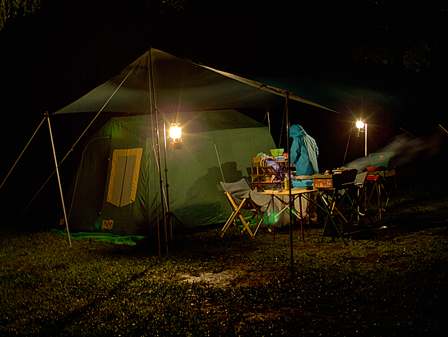 強く降る訳ではなく霧雨のような感じで風に舞ってタープの下に流れ込んでくる感じでした。
