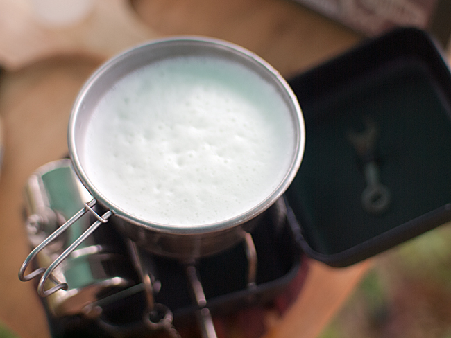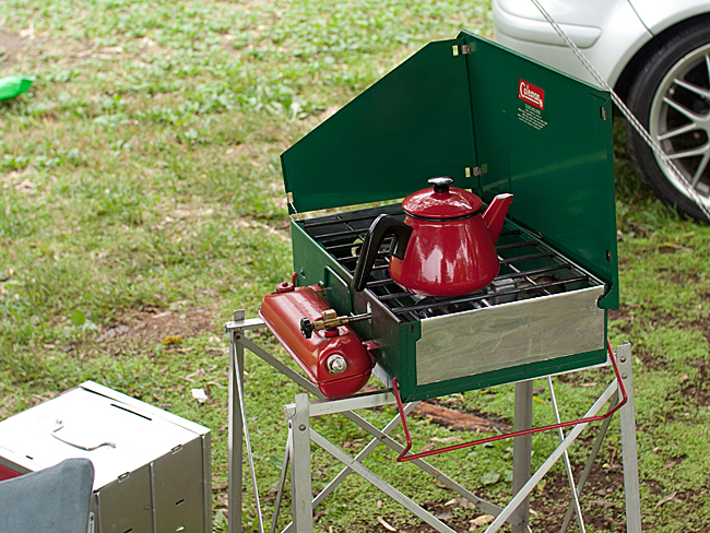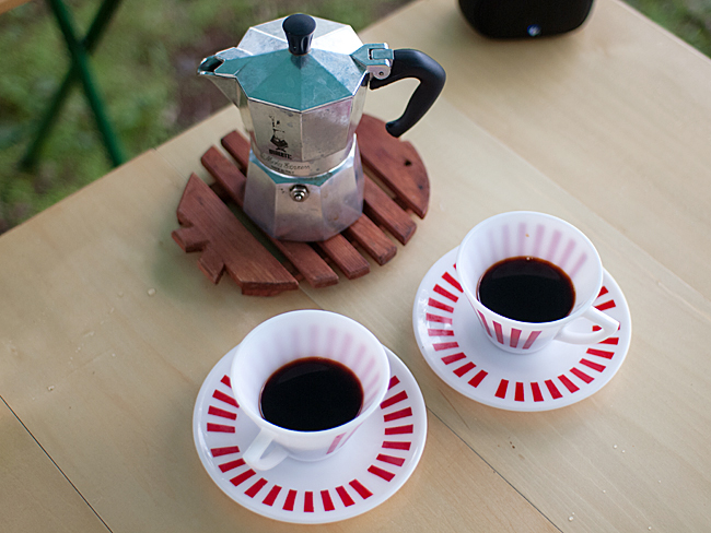 まずはモーニングコーヒー ミルクガラスはアウトドアで栄えますねぇ。