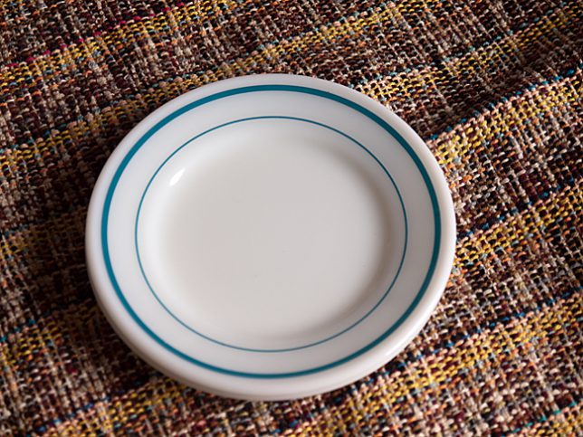 写真の食器はPyrexの60〜70年代に米軍のカフェテラスで使用されていたブルーバンドというプリントネームのサラダプレートです。2重のブルーストライププリントが特徴であります。