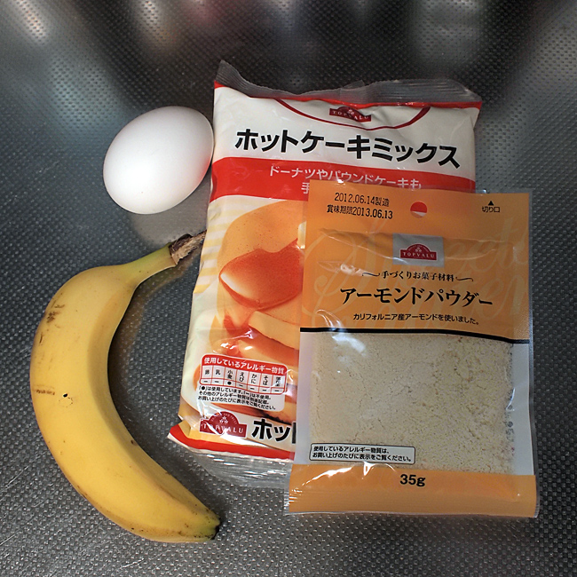 材料はホットケーキミックス200g、アーモンドパウダー15g、バナナ2.5本、卵1個、オリーブオイル30cc、牛乳30cc、砂糖15g。材料は計量をしなくてもいいように、計量スプーンを使います。30ccだと大さじ2杯。