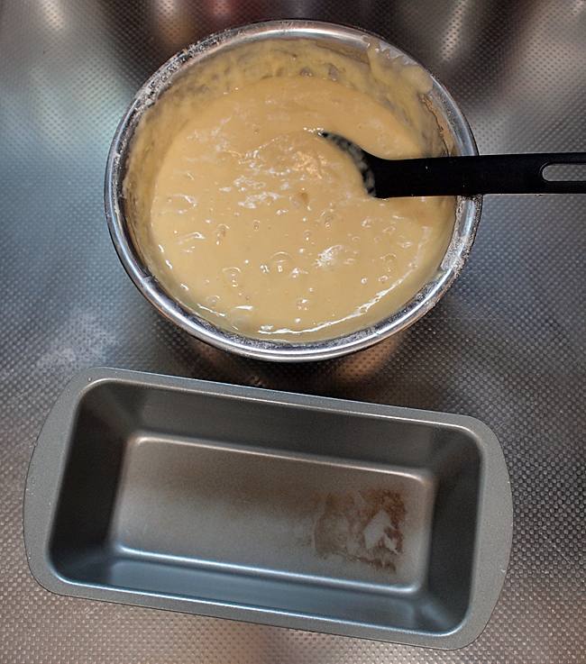 バナナ2本をフォークで潰して材料全部と混ぜてパウンドケーキの型に流し込みます。隠し味で塩麹を少し入れてます。
