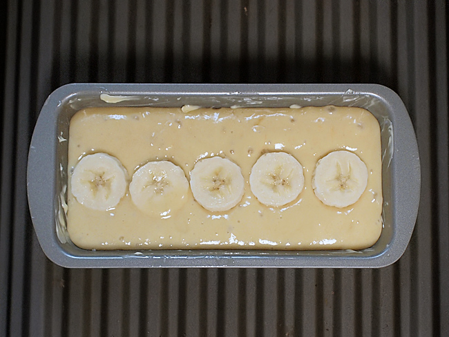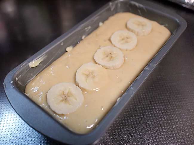 生地の上にトッピング用の輪切りバナナを載せます。型の廻りにバターを塗ってますがテフロン加工なので塗らなくても良かったかも。