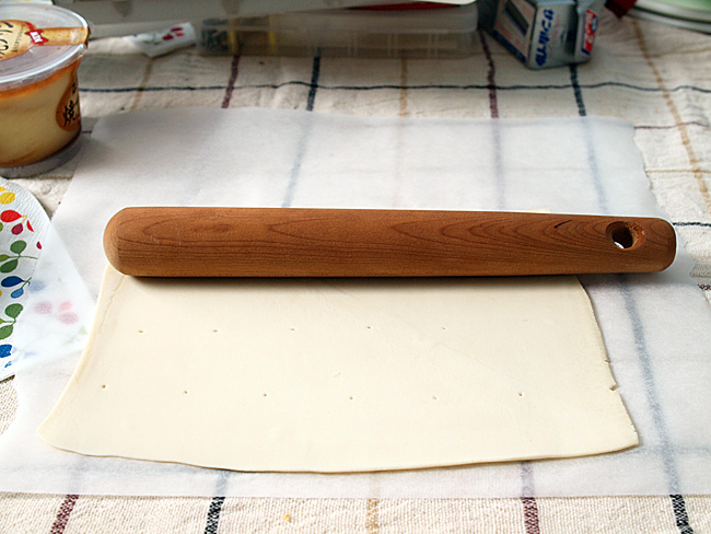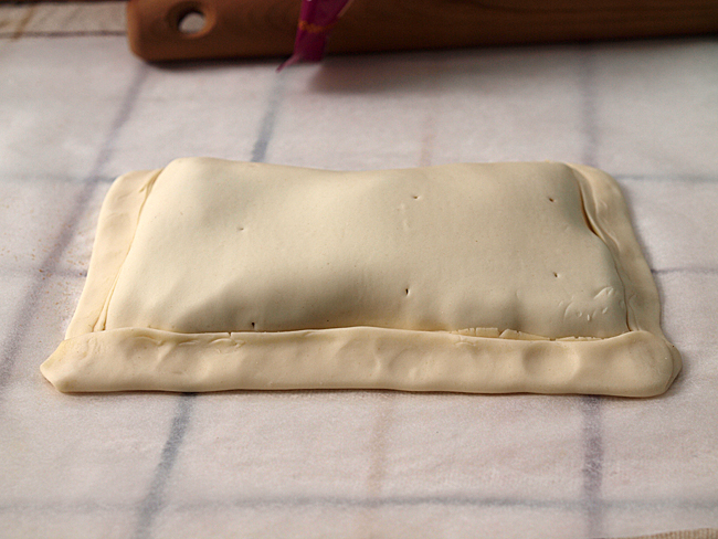 折り畳んで開かないように廻りを潰します。オーブンに入れる前に卵黄を少し塗ります。