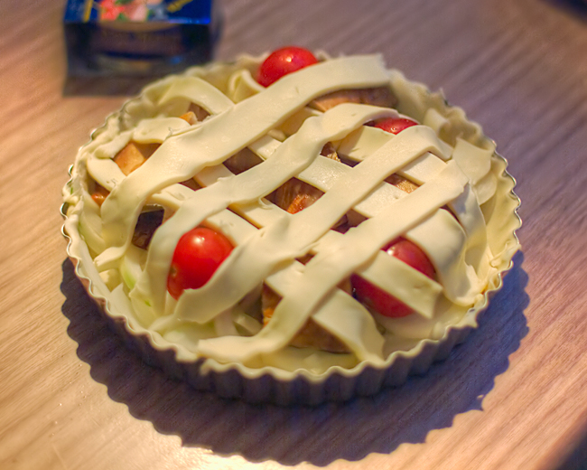 サバの薫製のパイ包み焼きはパイシートにタマネギスライスを敷いてサバ薫製、シメジ、プチトマト、モッツァレラチーズを載せて網目状にパイシートを載せます。