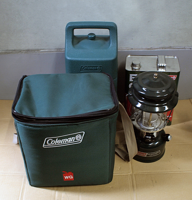 石川さん、発案の要らない道具交換会ではhihiさんのColeman 286ランタンとフューエルキャリーケースにホワイトガソリンの4L缶が(滝汗
