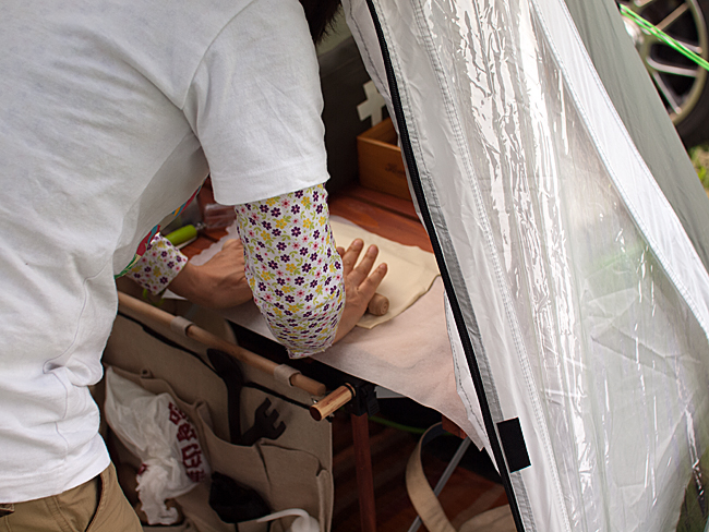 このテント、出入口の横幅180cmあるので風が入ってけっこう涼しいです。固定方法を工夫すればいい感じ♪