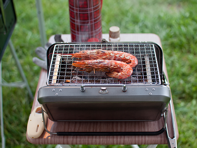 そのあいだに銚子港で水上げされた桜エビやホタテをテーブルトップグリルで焼きますよ♪