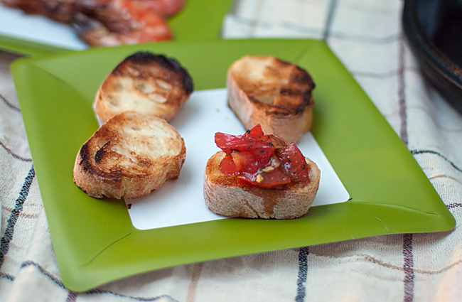 そのまま炭火でバケットも焼きます。1個だけブルスケッタをトッピング。