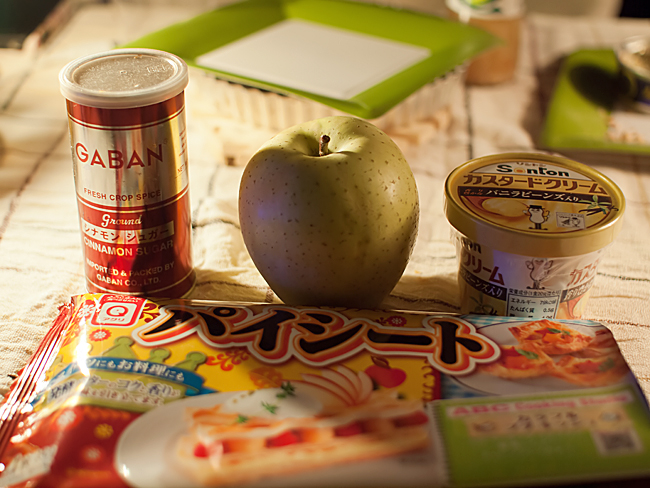 食後のデザートはいつもなら何か茶菓子を買ってくるんですが、今回は下の材料でアップルパイを作りますた。