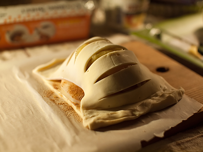 パイ生地に林檎を載せてシナモンシュガーをかけてカスタードクリームを少しのせて包みます。