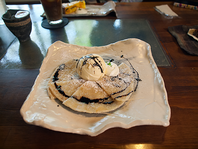 ケーキセットで自分は名前は忘れましたがガレットにバニラアイスが載ったものにバルサミコソースがかかったケーキにアイスコーヒー。オクタマはパンプキンのケーキとアイスコーヒーをお願いしました。