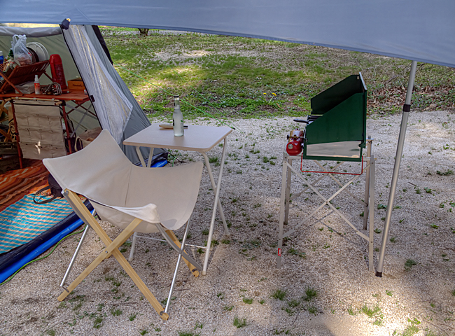 タープの下に椅子とサブテーブルを置いて料理をしながらカクテルを飲んだり。