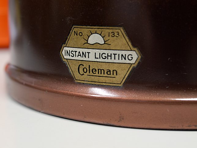 もう1台のテーブルランプ、Coleman 133は1938年製。ウチにある火器では最古のランプです。