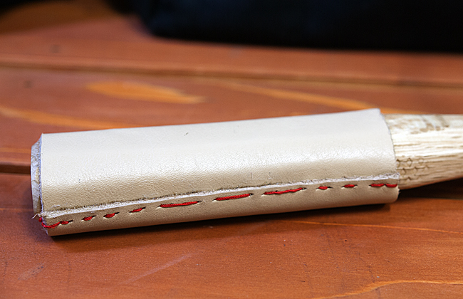 ペグハンマー PRO.Sのグリップ部は、おそらく滑り止めのディンプル加工が施行されていると思いますが、これが自分には痛くて牛革でグリップカバーを着けました。