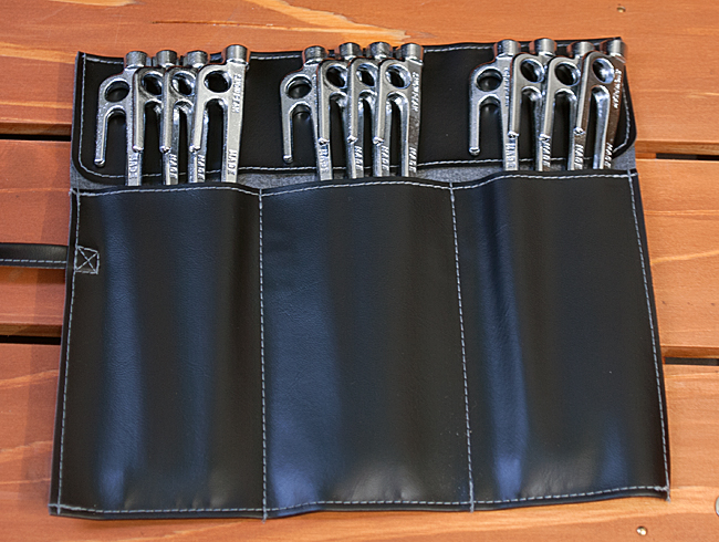 ペグのケースにロールペンケースを使ってみました。3カ所のポケットに4本づつ入れてますが、もう少し入ると思います。