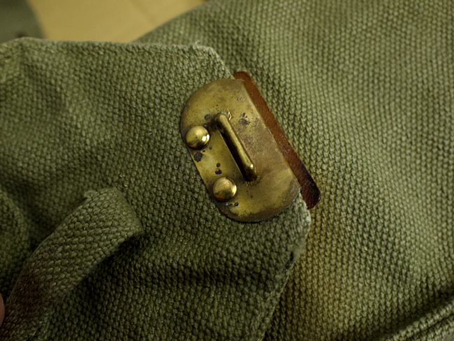 蓋の止め金具が変わっていて四角い穴に突起を入れて平網した紐を通すだけなのですが、これで固定されています。