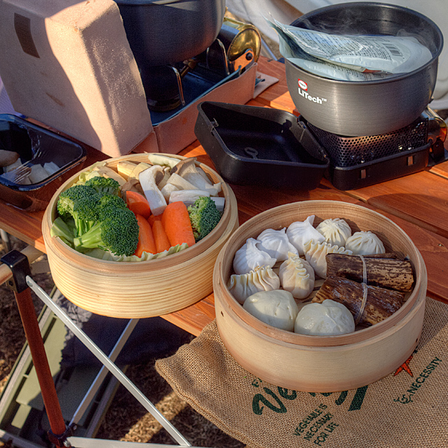 この蒸篭は2段でもコールマンのジャグの中にすっぽり入るのでいいですねぇ