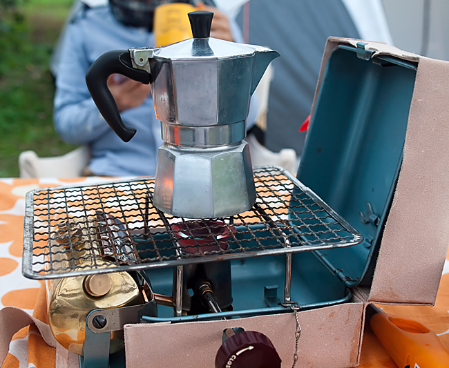 静かなキャンプの朝に爆音を轟かすため111Bをプレヒート中。